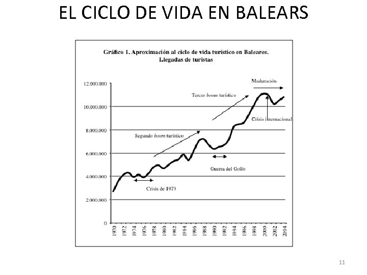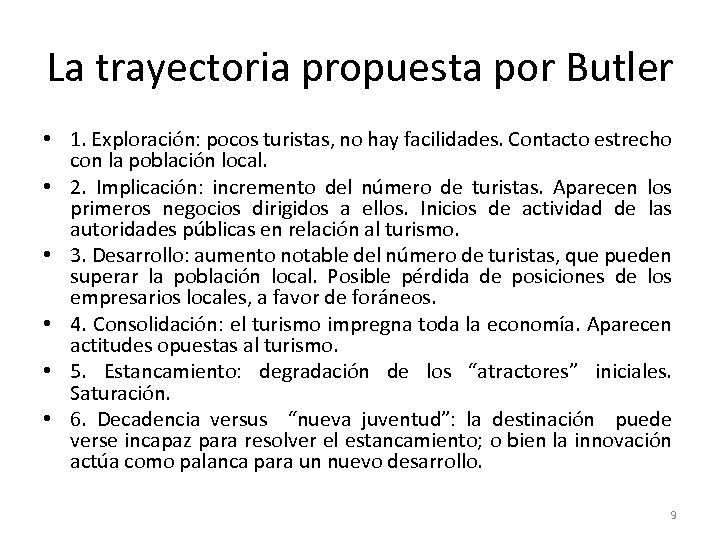La trayectoria propuesta por Butler • 1. Exploración: pocos turistas, no hay facilidades. Contacto estrecho con la población local. • 2. Implicación: incremento del número de turistas. Aparecen los primeros negocios dirigidos a ellos. Inicios de actividad de las autoridades públicas en relación al turismo. • 3. Desarrollo: aumento notable del número de turistas, que pueden superar la población local. Posible pérdida de posiciones de los empresarios locales, a favor de foráneos. • 4. Consolidación: el turismo impregna toda la economía. Aparecen actitudes opuestas al turismo. • 5. Estancamiento: degradación de los “atractores” iniciales. Saturación. • 6. Decadencia versus “nueva juventud”: la destinación puede verse incapaz para resolver el estancamiento; o bien la innovación actúa como palanca para un nuevo desarrollo. 9