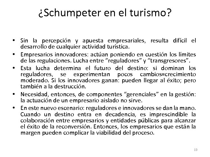 ¿Schumpeter en el turismo? • Sin la percepción y apuesta empresariales, resulta difícil el desarrollo de cualquier actividad turística. • Empresarios innovadores: actúan poniendo en cuestión los límites de las regulaciones. Lucha entre “reguladores” y “transgresores”. • Esta lucha determina el futuro del destino: si dominan los reguladores, se experimentan pocos cambios=crecimiento moderado. Si los innovadores ganan: pueden llegar al éxito; pero también a la destrucción. • Necesidad, entonces, de componentes “gerenciales” en la gestión: la actuación de un empresario aislado no sirve. • En este nuevo escenario: reguladores e innovadores se dan la mano. Cuando un destino entra en decadencia, es imprescindible la colaboración entre empresarios y entidades públicas para alcanzar el éxito de la reconversión. Entonces, los empresarios que están la margen pueden complicar la viabilidad del proceso. 13