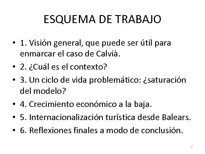 ESQUEMA DE TRABAJO • 1. Visión general, que puede ser útil para enmarcar el caso de Calvià. • 2. ¿Cuál es el contexto? • 3. Un ciclo de vida problemático: ¿saturación del modelo? • 4. Crecimiento económico a la baja. • 5. Internacionalización turística desde Balears. • 6. Reflexiones finales a modo de conclusión. 2