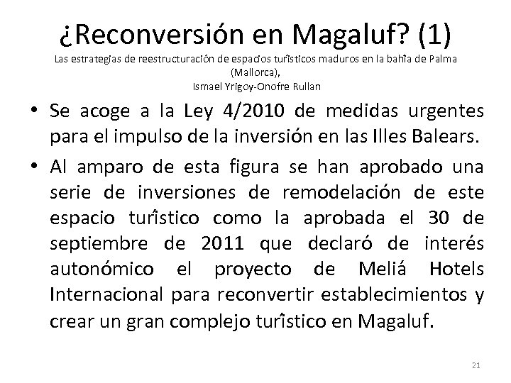 ¿Reconversión en Magaluf? (1) Las estrategias de reestructuracio n de espacios turi sticos maduros en la bahi a de Palma (Mallorca), Ismael Yrigoy-Onofre Rullan • Se acoge a la Ley 4/2010 de medidas urgentes para el impulso de la inversio n en las Illes Balears. • Al amparo de esta figura se han aprobado una serie de inversiones de remodelacio n de este espacio turi stico como la aprobada el 30 de septiembre de 2011 que declaro de intere s autono mico el proyecto de Melia Hotels Internacional para reconvertir establecimientos y crear un gran complejo turi stico en Magaluf. 21