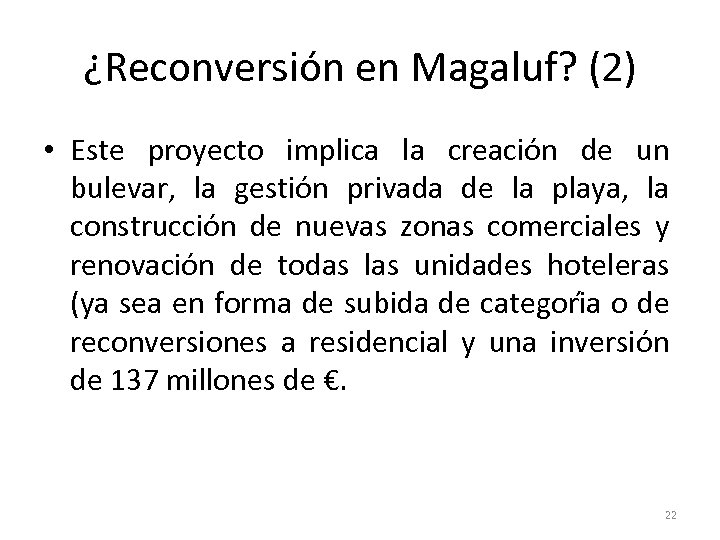 ¿Reconversión en Magaluf? (2) • Este proyecto implica la creacio n de un bulevar, la gestio n privada de la playa, la construccio n de nuevas zonas comerciales y renovacio n de todas las unidades hoteleras (ya sea en forma de subida de categori a o de reconversiones a residencial y una inversio n de 137 millones de €. 22