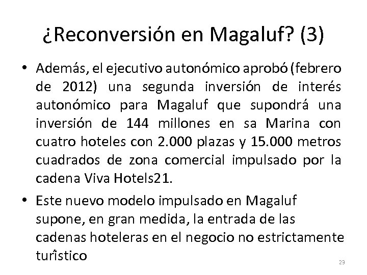 ¿Reconversión en Magaluf? (3) • Adema s, el ejecutivo autono mico aprobo (febrero de 2012) una segunda inversio n de intere s autono mico para Magaluf que supondra una inversio n de 144 millones en sa Marina con cuatro hoteles con 2. 000 plazas y 15. 000 metros cuadrados de zona comercial impulsado por la cadena Viva Hotels 21. • Este nuevo modelo impulsado en Magaluf supone, en gran medida, la entrada de las cadenas hoteleras en el negocio no estrictamente turi stico 23