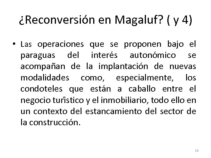 ¿Reconversión en Magaluf? ( y 4) • Las operaciones que se proponen bajo el paraguas del intere s autono mico se acompan an de la implantacio n de nuevas modalidades como, especialmente, los condoteles que esta n a caballo entre el negocio turi stico y el inmobiliario, todo ello en un contexto del estancamiento del sector de la construccio n. 24