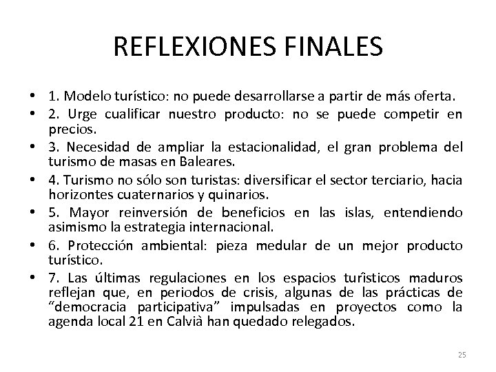 REFLEXIONES FINALES • 1. Modelo turístico: no puede desarrollarse a partir de más oferta. • 2. Urge cualificar nuestro producto: no se puede competir en precios. • 3. Necesidad de ampliar la estacionalidad, el gran problema del turismo de masas en Baleares. • 4. Turismo no sólo son turistas: diversificar el sector terciario, hacia horizontes cuaternarios y quinarios. • 5. Mayor reinversión de beneficios en las islas, entendiendo asimismo la estrategia internacional. • 6. Protección ambiental: pieza medular de un mejor producto turístico. • 7. Las u ltimas regulaciones en los espacios turi sticos maduros reflejan que, en periodos de crisis, algunas de las pra cticas de “democracia participativa” impulsadas en proyectos como la agenda local 21 en Calvia han quedado relegados. 25