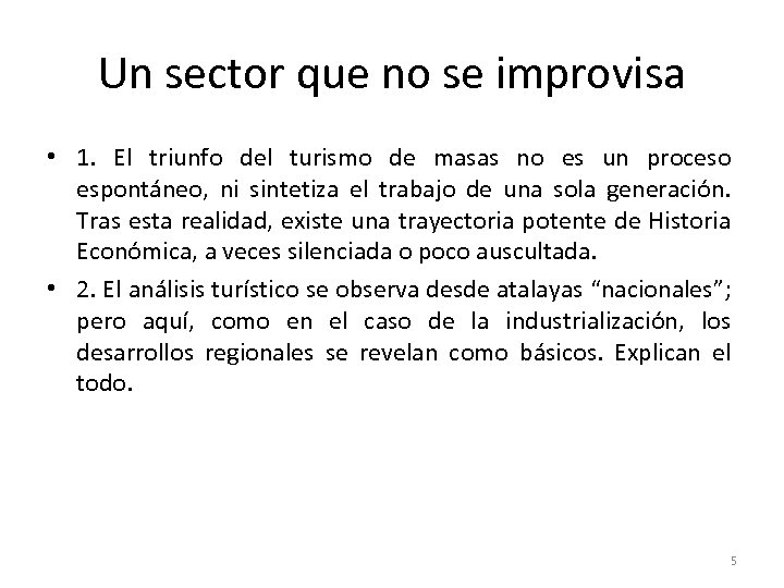 Un sector que no se improvisa • 1. El triunfo del turismo de masas no es un proceso espontáneo, ni sintetiza el trabajo de una sola generación. Tras esta realidad, existe una trayectoria potente de Historia Económica, a veces silenciada o poco auscultada. • 2. El análisis turístico se observa desde atalayas “nacionales”; pero aquí, como en el caso de la industrialización, los desarrollos regionales se revelan como básicos. Explican el todo. 5