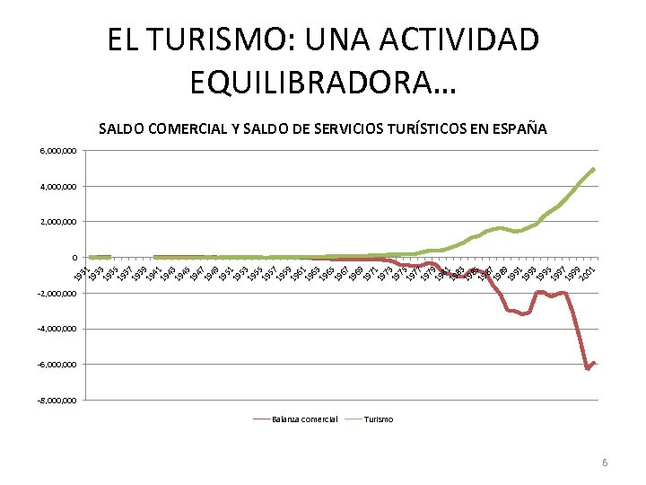 EL TURISMO: UNA ACTIVIDAD EQUILIBRADORA… SALDO COMERCIAL Y SALDO DE SERVICIOS TURÍSTICOS EN ESPAÑA 6, 000 4, 000 2, 000 19 31 19 33 19 35 19 37 19 39 19 41 19 43 19 45 19 47 19 49 19 51 19 53 19 55 19 57 19 59 19 61 19 63 19 65 19 67 19 69 19 71 19 73 19 75 19 77 19 79 19 81 19 83 19 85 19 87 19 89 19 91 19 93 19 95 19 97 19 99 20 01 0 -2, 000 -4, 000 -6, 000 -8, 000 Balanza comercial Turismo 6