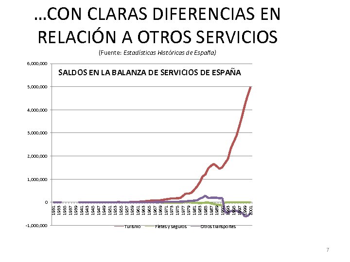 …CON CLARAS DIFERENCIAS EN RELACIÓN A OTROS SERVICIOS (Fuente: Estadísticas Históricas de España) 6, 000 SALDOS EN LA BALANZA DE SERVICIOS DE ESPAÑA 5, 000 4, 000 3, 000 2, 000, 000 1931 1933 1935 1937 1939 1941 1943 1945 1947 1949 1951 1953 1955 1957 1959 1961 1963 1965 1967 1969 1971 1973 1975 1977 1979 1981 1983 1985 1987 1989 1991 1993 1995 1997 1999 2001 0 -1, 000 Turismo Fletes y seguros Otros transportes 7