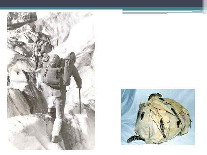 Рюкзак – заплечный вещевой мешок для переноски снаряжения и грузов. Прародители современных рюкзаков относились к трём основным типам: «Абалаковский» рюкзак «Яровский» рюкзак станковые рюкзаки