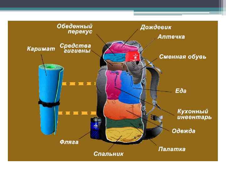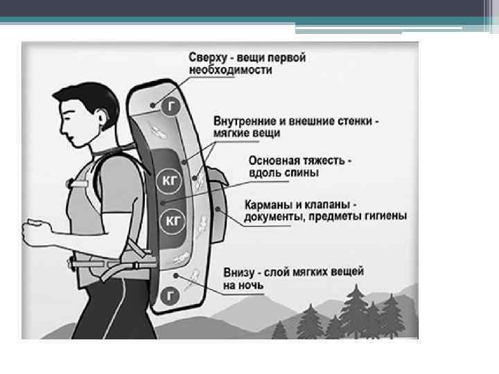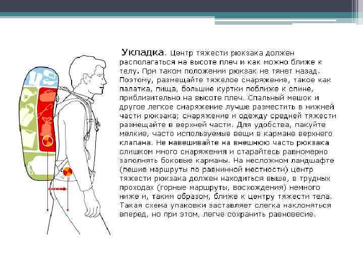 Укладка рюкзака Чтобы правильно уложить мягкий рюкзак, надо положить его на горизонтальную поверхность, расстегнуть все ремни или расшнуровать шнуровку. В рюкзак есть смысл положить полиэтиленовый мешок, большего объема, чем сам рюкзак, а в него уже укладывать вещи. Эта предосторожность укладки защитит содержимое рюкзака во время сильного дождя или в случае такой неприятности, как падение в воду. Полужесткий рюкзак удобней укладывать в вертикальном положении. При укладке рюкзаков этого типа разумно активно использовать коврик. Но при этом теряется часть объема рюкзака. Более тяжелые предметы укладываются ближе к телу, с центром тяжести на уровне крепления плечевых ремней, как это показано на картинке. Спальник и другие мягкие вещи укладываются внизу. Разумеется, простота извлечения частей снаряжения должна соответствовать вероятности их применения между ночевками. Нужно стремиться к максимально плотной укладке вещей. Заполняйте все пустоты мелкими, мягкими вещами. Избегайте крупных, объемных пакетов с вещами или продуктами. К примеру, не стоит 5 кг. картошки класть в один мешок и, потом, пытаться засунуть в рюкзак получившуюся бесформенную аномалию. Лучше разделите ее на столько маленьких мешочков, сколько у Вас будет приемов пищи. И с укладкой проблем не будет, да и выдавать картошку дежурным будет легче. Вещи, которые могут Вам понадобиться на предстоящем отрезке маршрута (кружку, аптечку, дождевик, смену одежды на случай резкой перемены погоды), укладываются сверху и в карманы, чтобы к ним был легкий и быстрый доступ. Обратите внимание на то, чтобы в спину Вам не упирались углами неудобные и жесткие предметы (консервные банки, посуда и т. д. ) Нужно постараться так укладывать свои вещи, чтобы в итоге ничего не гремело, чтобы продукты не рассыпались, чтобы хлеб не крошился В любой момент каждый турист должен знать, где что у него лежит, и не перерывать всякий раз рюкзак сверху донизу в поисках какой-либо мелочи Переносить следует исключительно за ручку, либо за наплечные ремни.