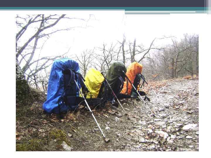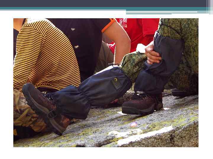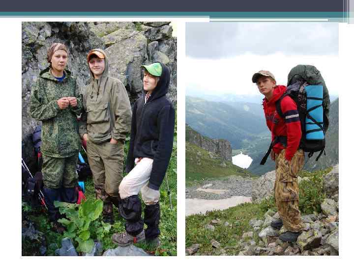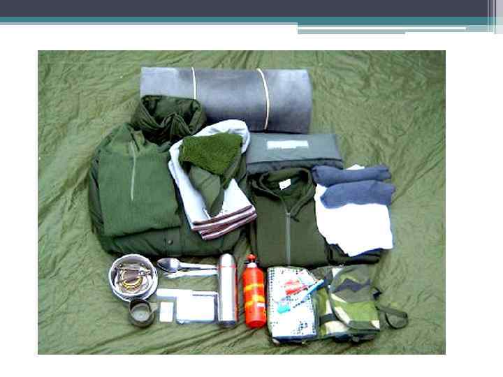 Перечень личного снаряжения Штормовой костюм или анорак Шерстяной (флисовый) спортивный костюм Куртка тёплая (или свитер шерстяной) Смена белья Рубашка Шорты, плавки (купальник) Носки шерстяные – 2 пары Носки х/б – 3 -4 пары Головной убор Очки солнцезащитные Ботинки туристские Кроссовки, шлёпки (? ) Полотенца, КЛМН Мыльно-рыльные принадлежности, туалетная бумага Накидка от дождя Ремнабор, перевязочный пакет Блокнот, ручка