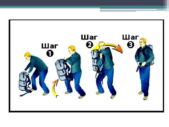 Как надевать рюкзак самому? Туристический рюкзак обычно получается несколько тяжелее привычных для нас городских рюкзачков. Поэтому не стоит лихо забрасывать его за спину. Причин тому три: чтобы не повредить себе спину; чтобы не потерять равновесие (это может быть важно на местности со сложным рельефом); чтобы у рюкзака не отлетела лямка, за которую Вы его поднимаете для заброски за спину. Поэтому поступаем следующим образом. Берем рюкзак за ручку (лямки) и сначала ставим его на бедро согнутой в колене ноги. Затем по очереди просовываем руки в наплечные ремни, как бы подлезая под рюкзак.