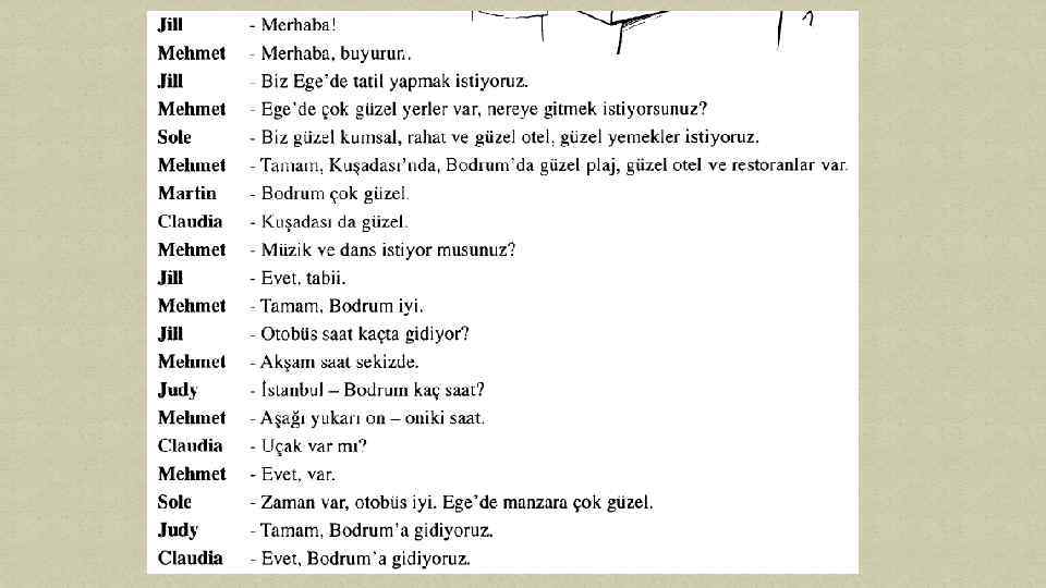 Diyalog. -Ali, hava alanına ne zaman gidiyorsunuz? -Yarın, sabahleyin saat altıda. -Peki, uçak saat kaçta kalkıyor? -Yedi buçukta. -Antalyada saat kaçta olacaksınız? -Saat onbirde. -İyi yolculuklar. -Saol.