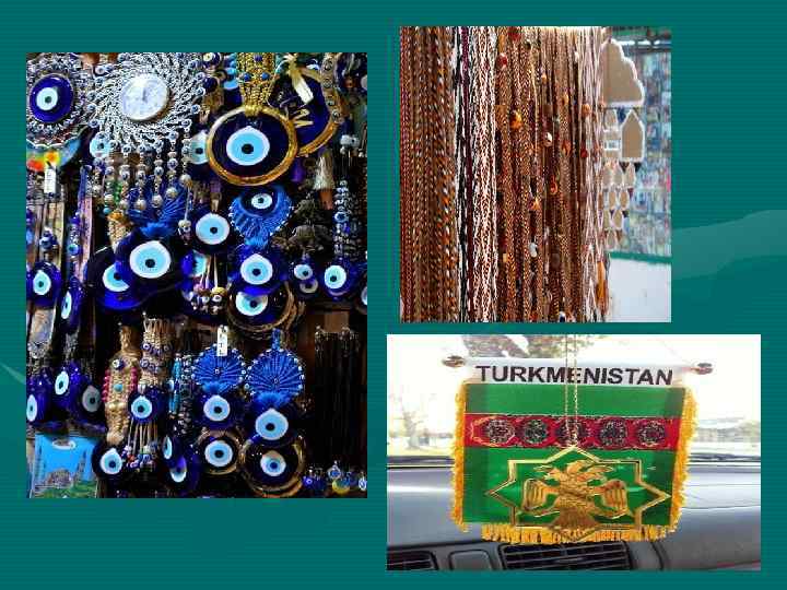 Обереги Практически вся свадебная одежда туркменских женщин, помимо прямого назначения - служить украшением невесты, выполняла и роль оберега. Наряд новобрачной состоял из различных амулетов, призванных защитить её от вредоносных сил, помочь сохранению здоровья и принести благополучие.