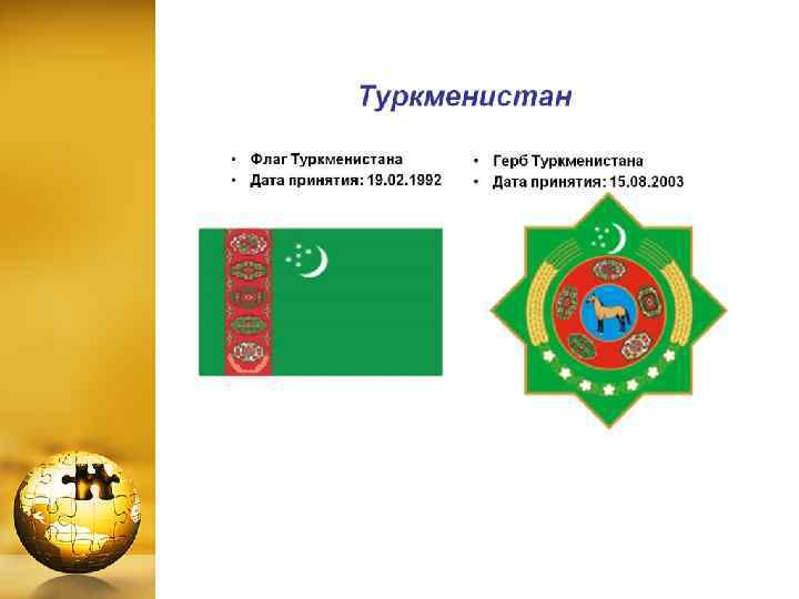 • Туркмения, является одним из Тюркоязычных государств в Центральной Азии. • Сегодняшний Туркменистан охватывает территорию, которая была на перекрестке цивилизаций на протяжении веков. В средневековые времена Мерв был одним из великих городов исламского мира, и важной остановкой на шелковом пути большая дорога используется для торговли с Китай до середины 15 -го века. • Столица страны — город Ашхабад. Является нейтральным государством • Президент Туркмении Гурбангулы Бердымухаммедов