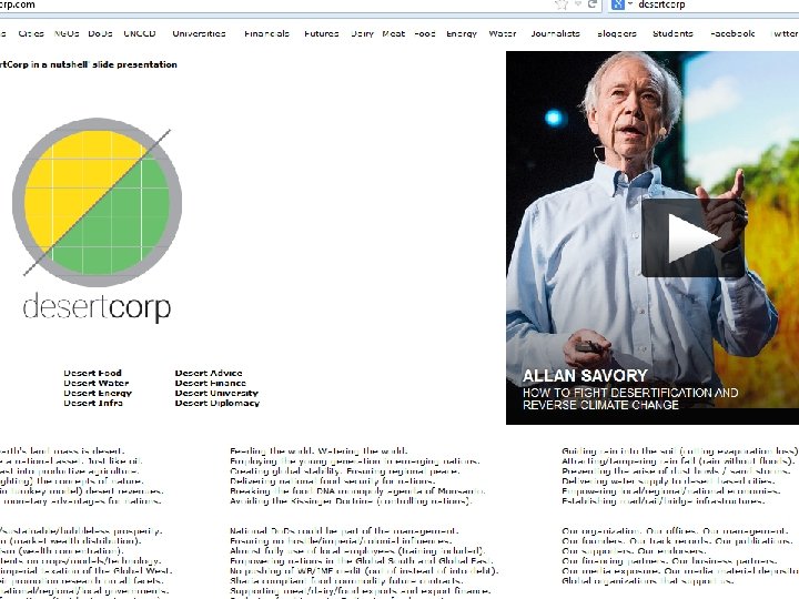 Why nations will choose Desert. Corp? • • • • • We deliver food security/independence. We deliver water security/independence. We deliver energy security/independence. We deliver huge infrastructure extension. We deliver new (not yet explored) huge economic potential. We deliver stable productive economic growth. We deliver not an unsustainable credit driven economic growth model. We deliver monetary stability (production: less import, more export). We deliver enormous job growth. We deliver not financial capitalism jobless growth, but real productivity based growth. We deliver the best available open technology. We deliver both external and internal finance models. We deliver a nation focused joint venture model (no imperial drain). We deliver a nation protection against imperial patent based capital looting. We deliver an anti bribe/corruption development model. We deliver nations a public interest model (a template for energy/mining). We think aid=imperialism and we stimulate a self-development models. We offer an ‘open source’ and a managed model (or a combination of those two)