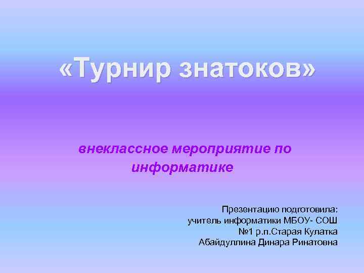 «Турнир знатоков» внеклассное мероприятие по информатике Презентацию подготовила: учитель информатики МБОУ- СОШ № 1 р. п. Старая Кулатка Абайдуллина Динара Ринатовна