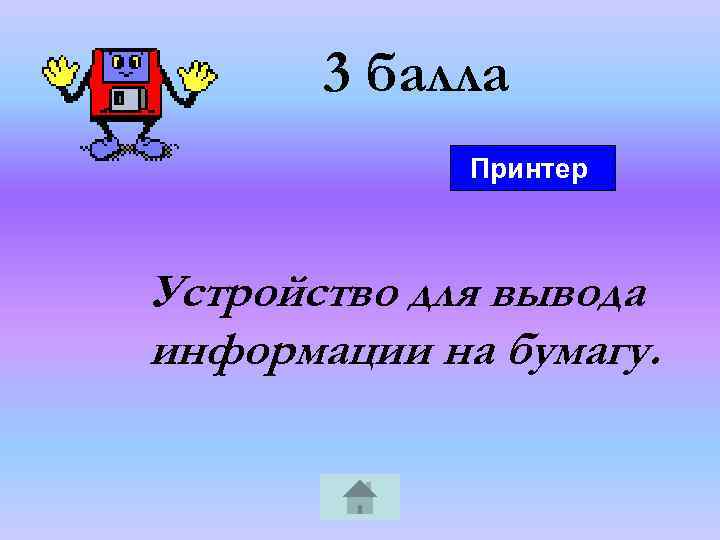3 балла Принтер Устройство для вывода информации на бумагу.