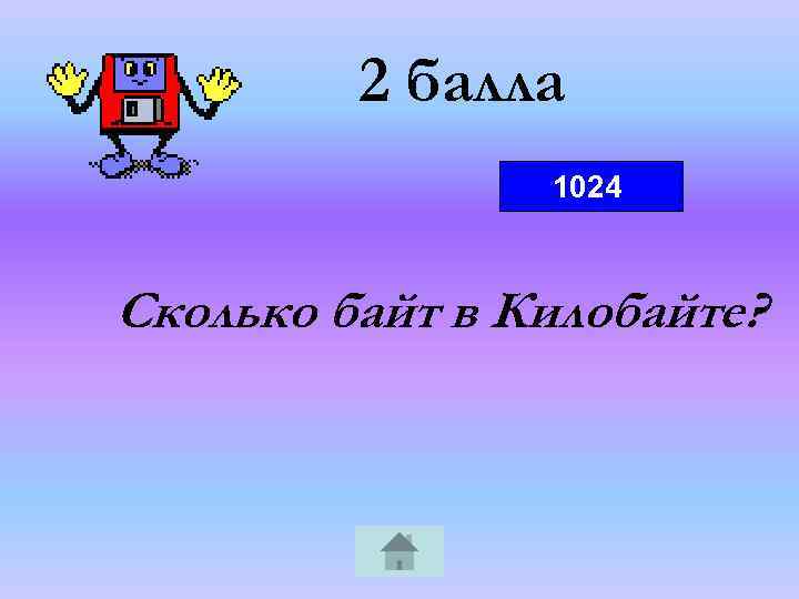 2 тур. "Дальше, дальше. . . " Вопросы для команды 2. 1. Центральное устройство компьютера 2. Сколько бит в одном байте 3. Поименованная область внешней памяти 4. Программы для подключения внешней памяти 5. Небольшая программа, которая может приписывать себя к другим программам 6. Что является носителем информации: клавиатура; мышь; магнитный диск; принтер. 7. Перечень файлов Процессор 8 Файл Драйверы Вирус Магнитный диск Каталог