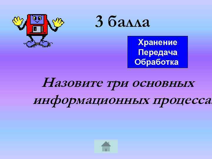 3 балла Хранение Передача Обработка Назовите три основных информационных процесса?