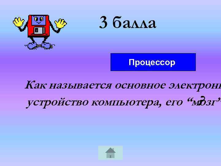 3 балла Процессор Как называется основное электронн устройство компьютера, его “мозг” ?