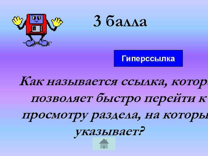 3 балла Гиперссылка Как называется ссылка, котора позволяет быстро перейти к просмотру раздела, на которы указывает?