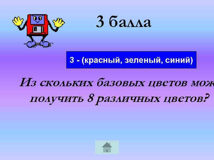 3 балла 3 - (красный, зеленый, синий) Из скольких базовых цветов мож получить 8 различных цветов?