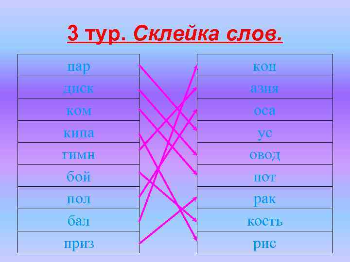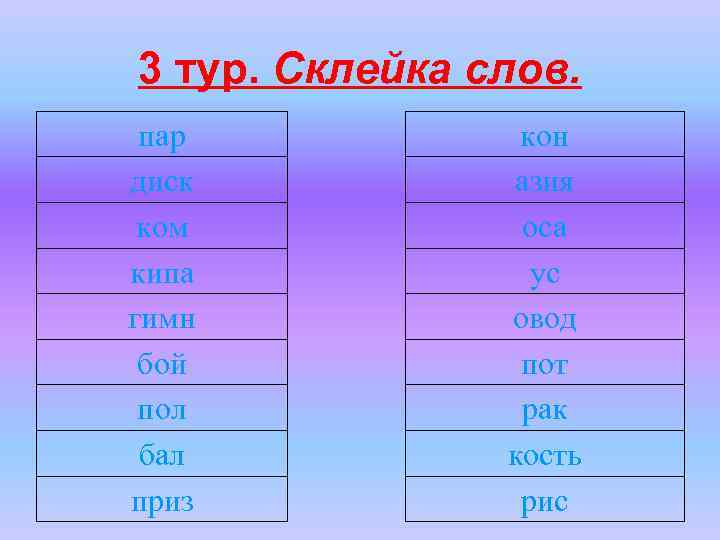 3 тур. Склейка слов. пар диск ком кипа гимн бой пол бал приз кон азия оса ус овод пот рак кость рис