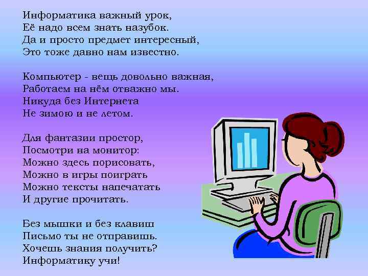 Информатика важный урок, Её надо всем знать назубок. Да и просто предмет интересный, Это тоже давно нам известно. Компьютер - вещь довольно важная, Работаем на нём отважно мы. Никуда без Интернета Не зимою и не летом. Для фантазии простор, Посмотри на монитор: Можно здесь порисовать, Можно в игры поиграть Можно тексты напечатать И другие прочитать. Без мышки и без клавиш Письмо ты не отправишь. Хочешь знания получить? Информатику учи!