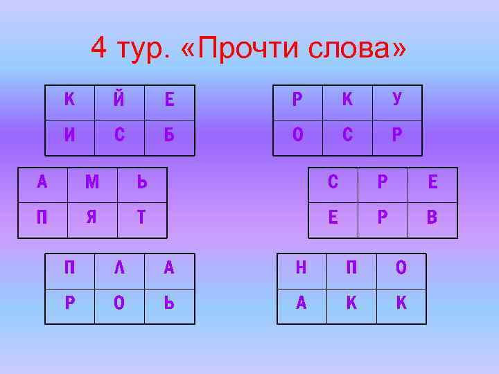 4 тур. «Прочти слова» К Й Е Р К У И С Б О С Р А М Ь С Р Е П Я Т Е Р В П Л А Н П О Р О Ь А К К