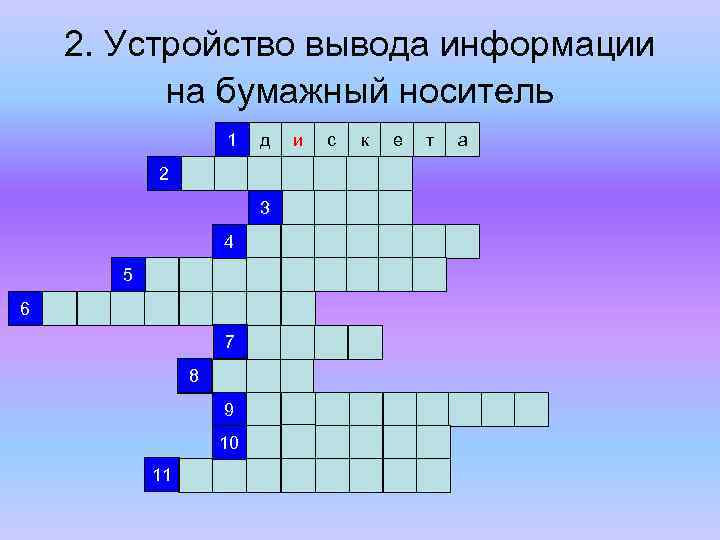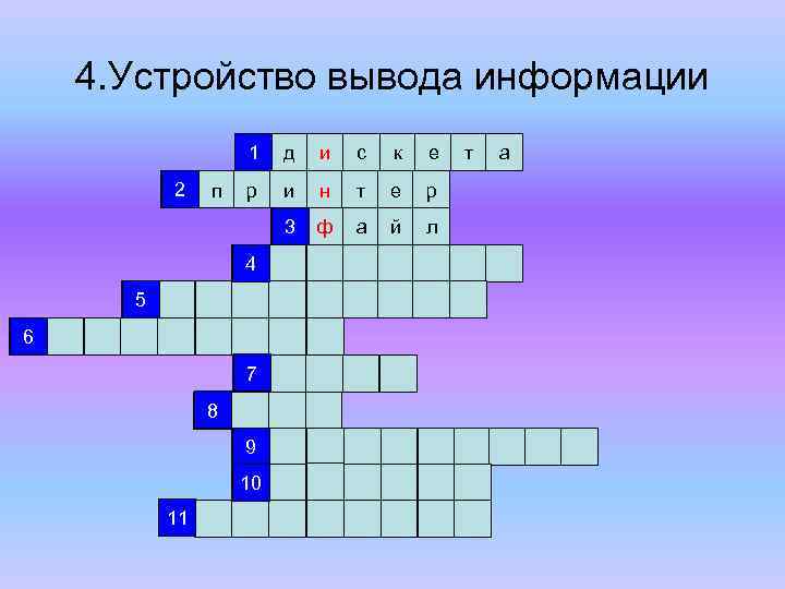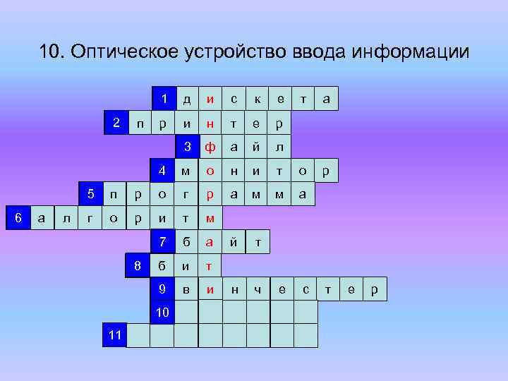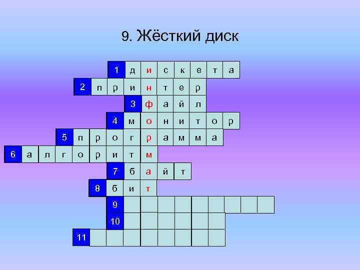 9. Жёсткий диск 1 с к е р и н т е р ф а й л 4 п и 3 2 д м о н и а м й т 5 6 а л п р о г р г о р и т м 7 б а б и т 8 9 10 11 т а т о р м а