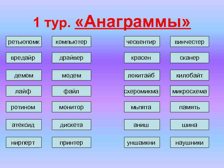 1 тур. «Анаграммы» ретьюпомк компьютер чесвентир винчестер вредайр драйвер красен сканер демом модем локитайб килобайт лайф файл схеромикма микросхема ротином монитор мьпята память атексид дискета аниш шина нирперт принтер уншаикни наушники