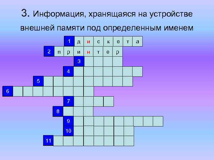 3. Информация, хранящаяся на устройстве внешней памяти под определенным именем 1 2 п д и с к е р и н т е р 3 4 5 6 7 8 9 10 11 т а