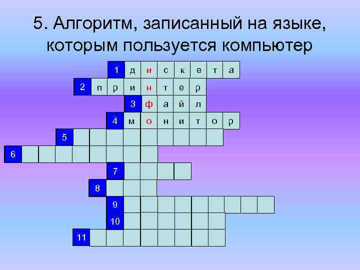 5. Алгоритм, записанный на языке, которым пользуется компьютер 1 п и с к е р и н т е р 3 2 д ф а й л м о н и т 4 5 6 7 8 9 10 11 т а о р