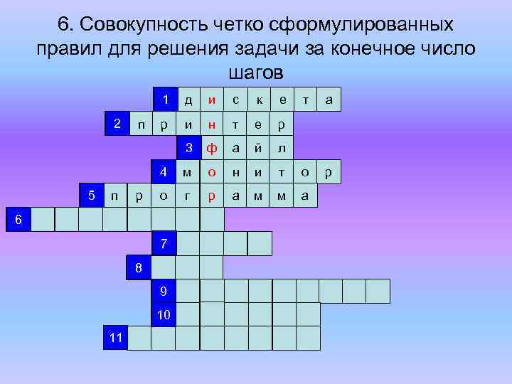 6. Совокупность четко сформулированных правил для решения задачи за конечное число шагов 1 5 п р с к е р и н т е р ф а й л 4 п и 3 2 д м о н и о г р а м 6 7 8 9 10 11 т а т о р м а
