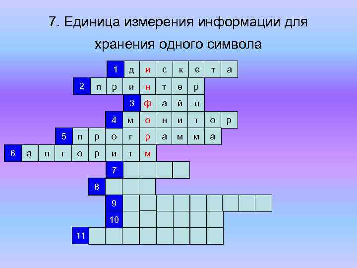 7. Единица измерения информации для хранения одного символа 1 с к е р и н т е р ф а й л 4 п и 3 2 д м о н и а м 5 6 а л п р о г р г о р и т м 7 8 9 10 11 т а т о р м а