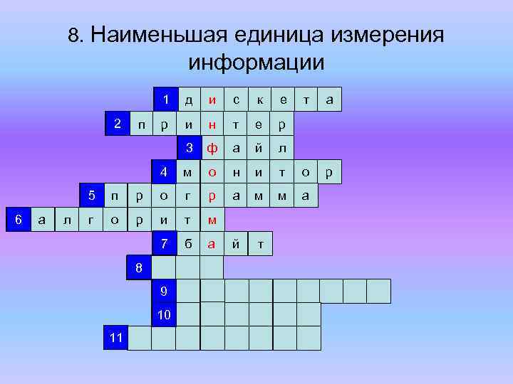 8. Наименьшая единица измерения информации 1 с к е р и н т е р ф а й л 4 п и 3 2 д м о н и а м й т 5 6 а л п р о г р г о р и т м 7 б а 8 9 10 11 т а т о р м а