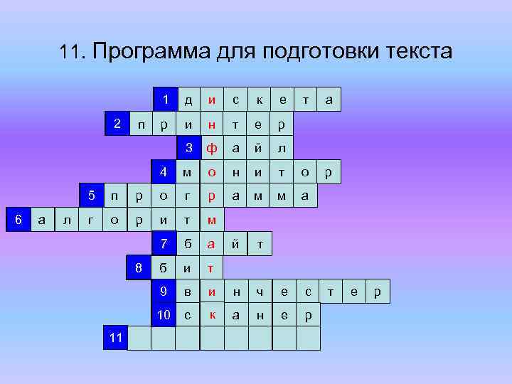 11. Программа для подготовки текста 1 с к е р и н т е р ф а й л 4 п и 3 2 д м о н и а м й т т а т о р м а 5 6 а л п р о г р г о р и т м 7 б а б и т 9 в и н ч е с 10 с к а н е р 8 11 т е р