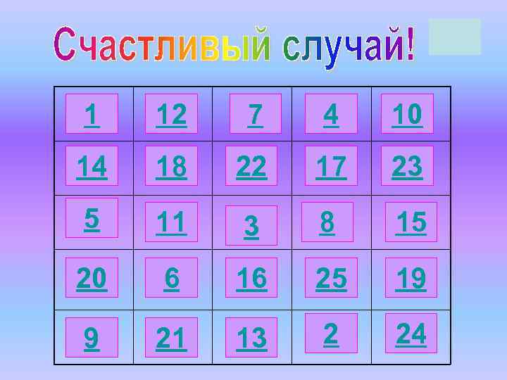 1 12 7 4 10 14 18 22 17 23 5 11 3 8 15 20 6 16 25 19 9 21 13 2 24