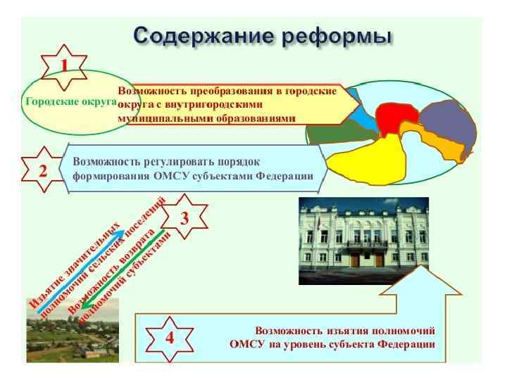 ПЕРСПЕКТИВЫ МУНИЦИПАЛЬНОЙ РЕФОРМЫ Перераспределение такого рода может быть двусторонним, т. е. субъект РФ вправе изъять некоторые полномочия у органов местного самоуправления, либо передать им какие-то свои полномочия. Однако при этом не допускается отнесение к компетенции органов госвласти субъекта Федерации полномочий органов МСУ в сферах управления муниципальной собственностью, формирования, утверждения и исполнения местного бюджета, осуществления охраны общественного порядка, установления структуры органов МСУ, изменения границ территории муниципального образования, а также ряда иных полномочий, которые предусмотрены пп. 1, 2, 7, 8 ч. 1 ст. 17 (ряд общих полномочий по решению ВМЗ) и ч. 10 ст. 35 (исключительная компетенция представительного органа МСУ) ФЗ № 131 -ФЗ от 6. 10. 2003 г. При этом указанное перераспределение полномочий допускается на срок не менее срока полномочий законодательного (представительного) органа госвласти субъекта РФ.