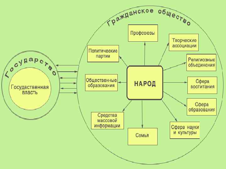 Социальная основа Социальную сторону правового государства составляет саморегулирующееся гражданское общество, которое объединяет свободных граждан — носителей общественного прогресса. В центре внимания такого государства находится человек, его разнообразные интересы. Через систему социальных институтов, общественных связей создаются необходимые условия для реализации каждым гражданином своих творческих, трудовых возможностей; обеспечиваются плюрализм мнений, личные права и свободы.