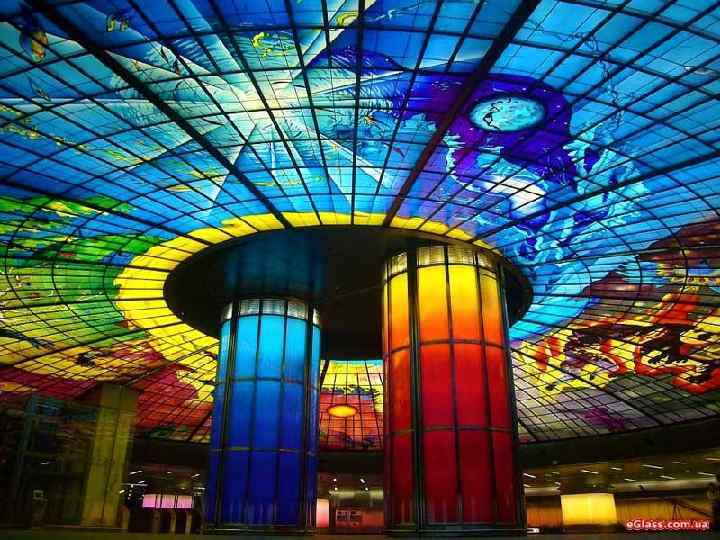 • Виды витражей Литой витраж Каждый модуль стекла отливается вручную либо выдувается. Стеклу, толщина которого варьируется от 5 до 30 мм также придается поверхностная фактура, которая преломляя свет усиливает выразительность. Для скрепления стекол используется цементный раствор и металлическая арматура.