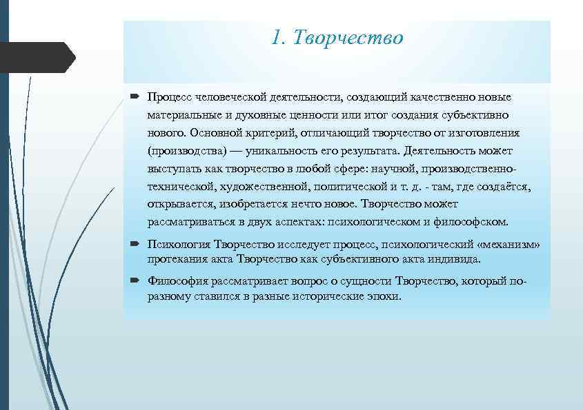 1. Творчество Процесс человеческой деятельности, создающий качественно новые материальные и духовные ценности или итог создания субъективно нового. Основной критерий, отличающий творчество от изготовления (производства) — уникальность его результата. Деятельность может выступать как творчество в любой сфере: научной, производственнотехнической, художественной, политической и т. д. - там, где создаётся, открывается, изобретается нечто новое. Творчество может рассматриваться в двух аспектах: психологическом и философском. Психология Творчество исследует процесс, психологический «механизм» протекания акта Творчество как субъективного акта индивида. Философия рассматривает вопрос о сущности Творчество, который поразному ставился в разные исторические эпохи.