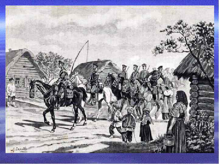 Рекрутчина Пожарные трубы, применяемые против причитальщиц, вызывают ассоциацию с разгоном демонстрации. Во второй половине 60 годов 19 века набор в армию резко увеличился. Солдаты давали клятву об отречении от родных, за укрывательство рекрута следовало жестокое наказание. Несладкой была жизнь солдата. " За богом молитва, за царем служба не пропадут!" - но отставные рекруты доживали жизнь в богадельнях, в Олонецкой губернии искали беглых солдат из далекой Сибири, подделывались "контр-квитанции" от службы в армии. "Солдат не брат", - приговаривала Ирина Федосова, - "с солдатом дружись, а за топор держись!". Солдаты пили и дрались, убивали хозяек постоялых дворов, двое ограбили Соломенскую и Деревянскую церкви, но, как сообщает газета "Олонецкие Губернские Ведомости" - похищенные крест с финифтью и две серебряных тарелки были обнаружены и возвращены… •