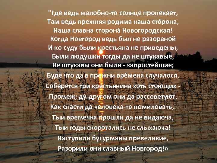 "Где ведь жалобно-то солнце пропекает, Там ведь прежняя родима наша сто рона, Наша славна сторона Новогородская! Когда Новгород ведь был не разореной И ко суду были крестьяна не приведены, Были людушки тогды да не штукавые, Не штукавы они были - запростейшие; Буде что да в прежни вре мена случалося, Соберется три крестьянина хоть стоющих Промеж; ду -другом они да рассоветуют, Как спасти да человека-то помиловать, . Тыи времечка прошли да не видаюча, Тыи годы скоротались не слыхаюча! Наступили бусурманы превеликие, Разорили они славный Новгород!»
