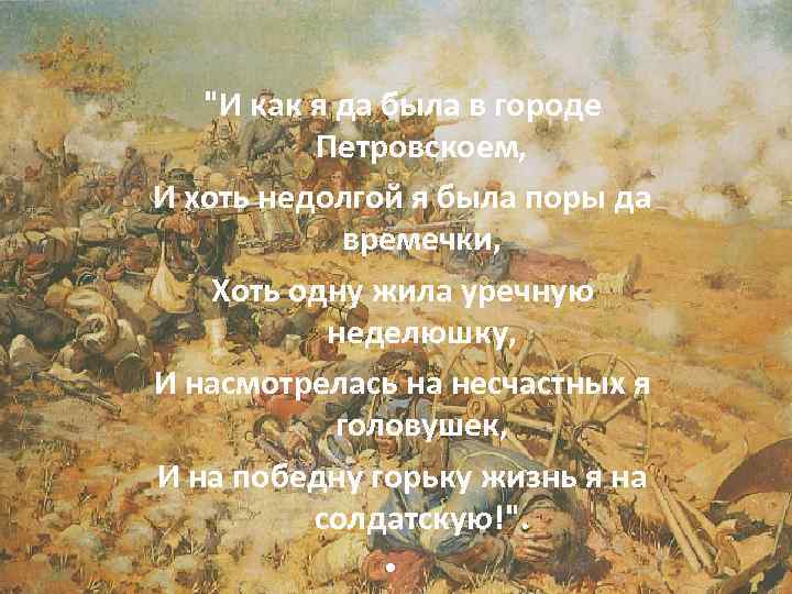 "И как я да была в городе Петровскоем, И хоть недолгой я была поры да времечки, Хоть одну жила уречную неделюшку, И насмотрелась на несчастных я головушек, И на победну горьку жизнь я на солдатскую!". •