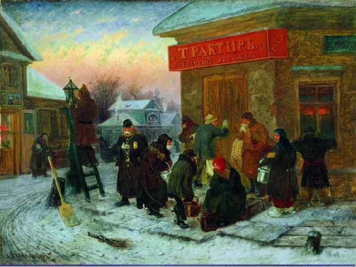 Пьянство – главный порок народа "Пьянство, главный порок народа, усилилось в тех местах, где в условиях наибольшей густоты населения и наиболее развитой промышленности умножилось число питейных заведений" . В губернской газете встречаются списки. . . "опившихся", то есть умерших от чрезмерных "возлияний!. . . Государство поощряло пьянство. Спиртного продавалось много, в архиве встретилось прошение швейцарского подданного Кнухеля к правлению - дать разрешение на выделку вина изо …мха! В 1865 г. на Набережной улице в Петрозаводске существовала «ресторация с продажей питий» , которую содержала жена отпускного рядового Шмула Бобермана, «трактирное заведение» Герша Каца, Питейный дом Ириньи Сухаревой. На Соломенской был чем-то знаменитый, очевидно, печально, трактир Гладкова. Питейные дома, погребки владельцев всех национальностей и вероисповеданий заполняли город.