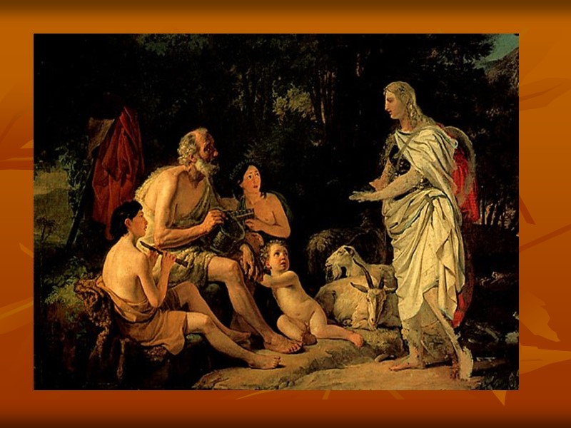 Итальянский полдень 1827 год Моделью послужила невысокая плотная женщина, далеко не классических пропорций, уже пережившая свою юность. Но она покорила художника ярким блеском широко расставленных глаз, а главное - брызжущей через край жизненной силой. Зрелая красота героини под стать налитой солнцем и соками земли грозди винограда, которой она любуется. Зенит дня, зенит жизни природы, пора созревания плодов - зенит человеческой жизни.