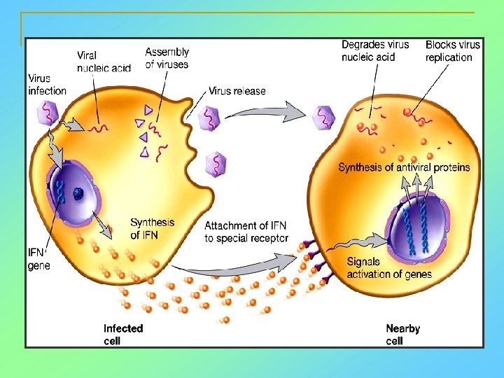 Interferons (IFNs) n Interferons (IFNs) are antiviral proteins produced in response to viral infection. n n n alpha-IFN, beta-IFN, gamma-IFN. The mode of action of -IFN and -IFN is to induce uninfected cells to produce antiviral proteins (AVPs) that prevent viral replication. Interferons are host-cell–specific but not virus-specific. Gamma-interferon activates neutrophils and macrophages to kill bacteria.