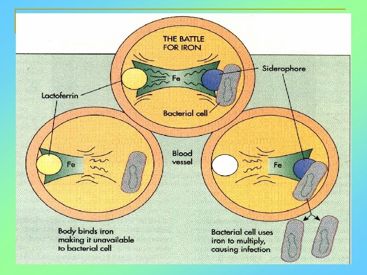 Transferrins are iron-binding proteins. Inhibit bacterial growth by reducing the amounts of available iron. Lactoferrin is present in tears, semen, breast milk, bile, and nasopharyngeal, bronchial, cervical, and intestinal mucosal secretions. Transferrin is present in serum and the intercellular spaces of many tissues and organs. Transferrin transports iron from the small intestine, where the iron is absorbed, to the tissues, where the iron is used. Transferrin and lactoferrin bind iron, limiting the growth of pathogens in the blood.