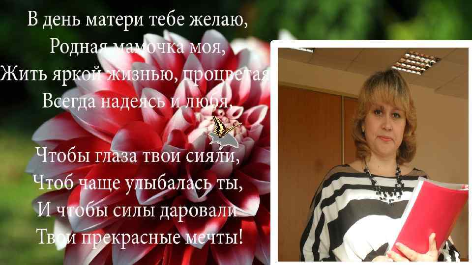 Милая мама, дорогая, С праздником жизни, тепла и любви, Я от души тебя поздравляю Радости, счастья, здоровье желаю Чаще смеяться, меньше грустить, Все неприятности прочь отпусти, Пусть будет жизнь как цветок, Я для тебя написала стишок